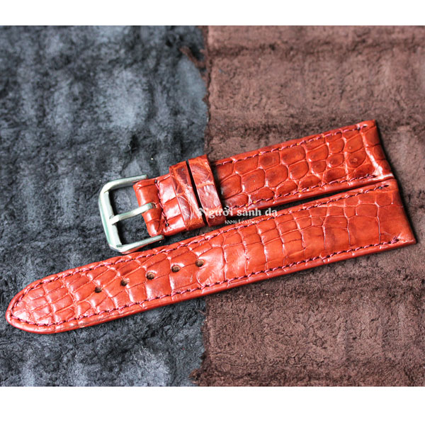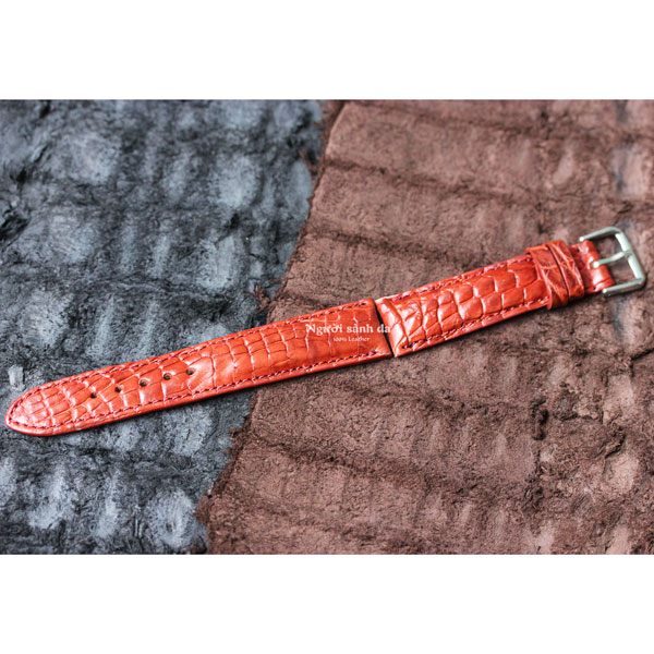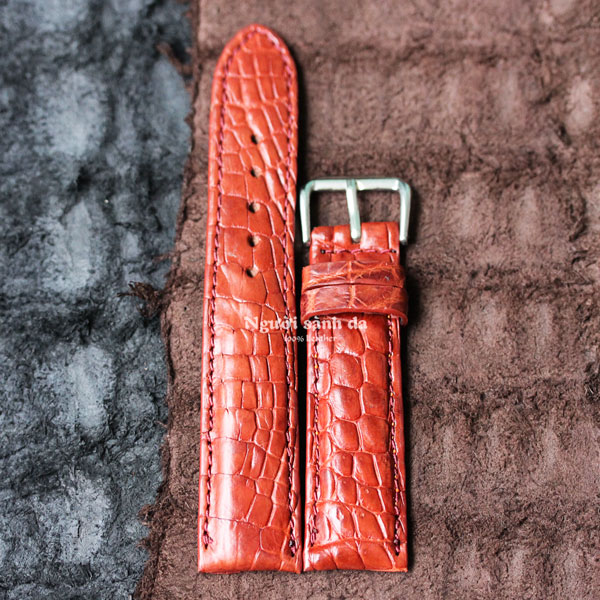 Dây đồng hồ với chất liệu mặt ngoài từ da tay cá sấu trưởng thành, mặt trong bằng da bò. Dạng hoa văn hạt cá sấu giúp nổi bật dây đồng hồ hơn so với các phần da trơn khác.