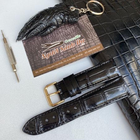 Dây đồng hồ cá sấu da bụng thật màu đen. Dạng vân da cá sấu khá phổ biến nên dễ khiến dây đồng hồ bị nhầm lẫn với hàng giả da cá sấu do có bề ngoài khá giống nhau. Size 18, 20, 22mm