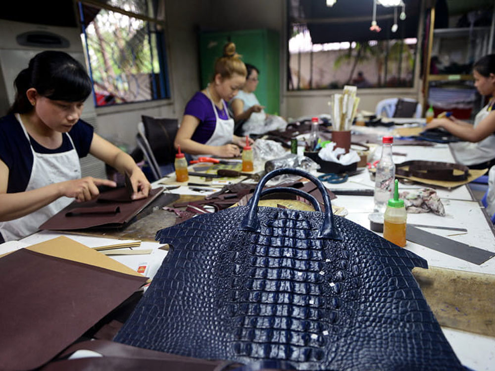 Một xưởng gia công đạt chuẩn phải có sự góp mặt của các nghệ nhân với đôi bàn tay lành nghề để tạo nên các mẫu túi đẹp và chất lượng. Nghề làm túi xách da cá sấu ở Sài Gòn bắt nguồn từ các thợ chính trong một công ty Hàn Quốc. Những người thợ này đươc đào tạo bài bản từ những chuyên gia nước ngoài, họ thực sự là một nghệ nhân. Tuy nhiên số lượng người đạt đến trình độ này hiện nay không quá 10 người và không phải ai cũng còn gắn bó với nghề. Còn lại các phân xưởng thế hệ F1 trở đi đều học lại từ những nghệ nhân này, tuy nhiên chỉ học được một phần nào đó rồi về tự mày mò, chắp vá công đoạn. Những người thợ thế hệ này chúng tôi gọi là bán chuyên, nói chung là trình độ chưa tới. Một phân xưởng mở ra làm đủ các mặt hàng về da cá sấu như túi, ví, thắt lưng, dây đồng hồ,…Đa dạng là thế nhưng nếu xét về tính thẫm mỹ và cái hồn thì không thể so sánh được với các bậc tiền bối lão làng thuở xưa. Do đó, giá bán của các loại túi xách da cá sấu còn phải phụ thuộc vào bàn tay của những người thợ trong nghề.