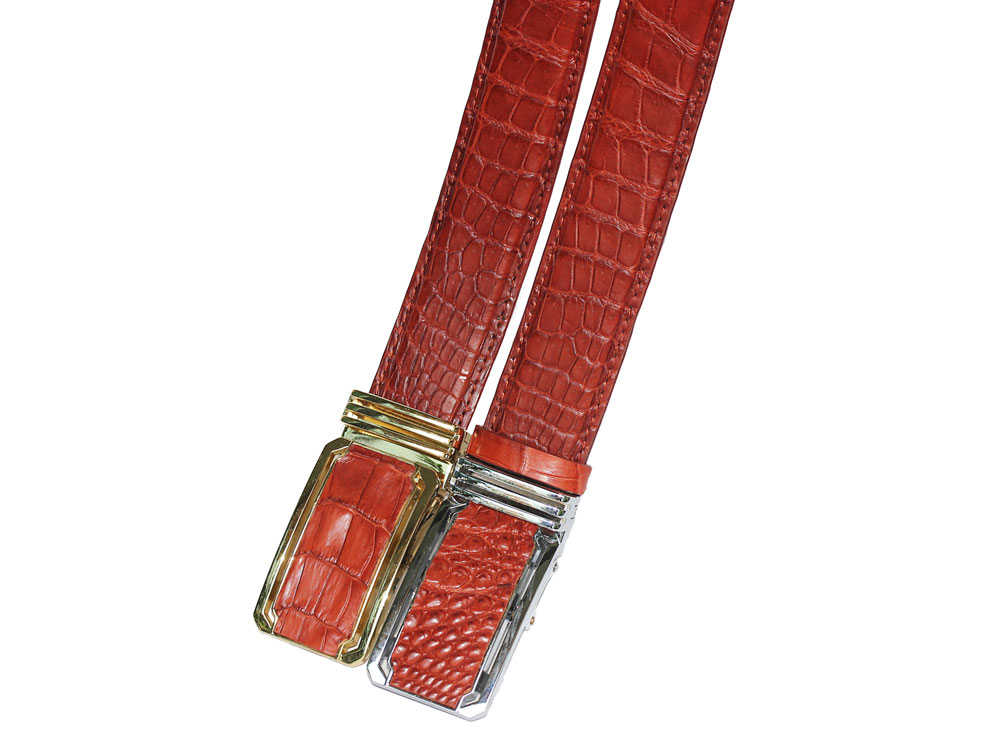 Thắt lưng cá sấu da bụng màu nâu đỏ được sử dụng phần da bụng nguyên miếng giữ nguyên được các đường vân bụng nổi bật kết hợp với mặt khóa sang trọng.