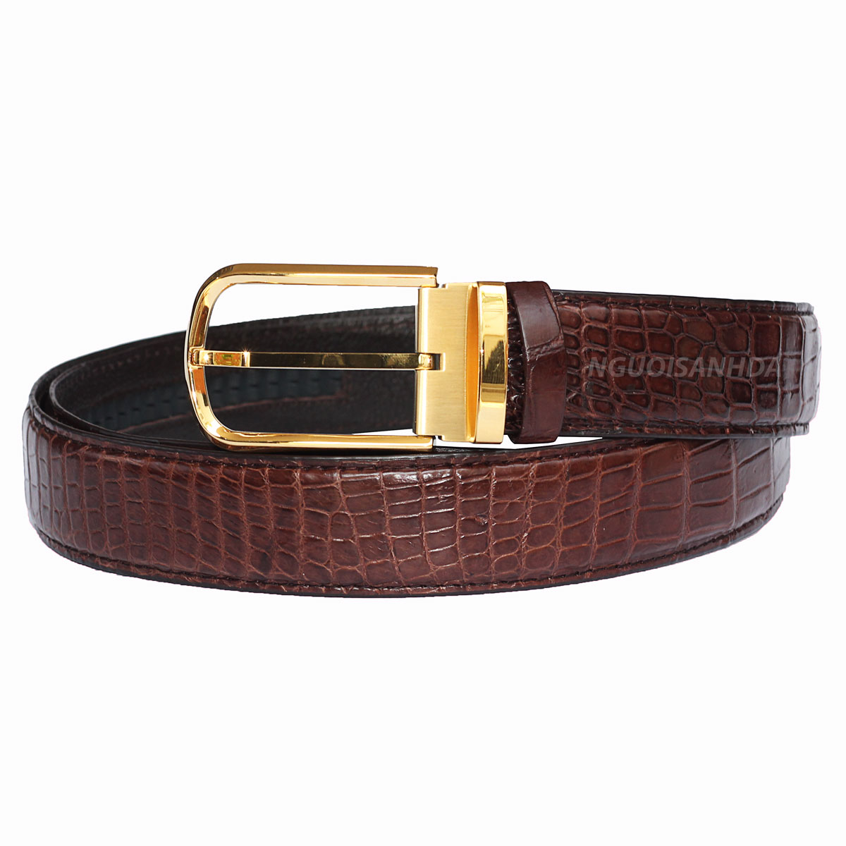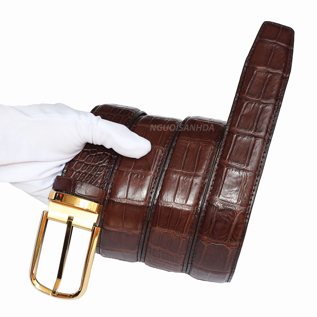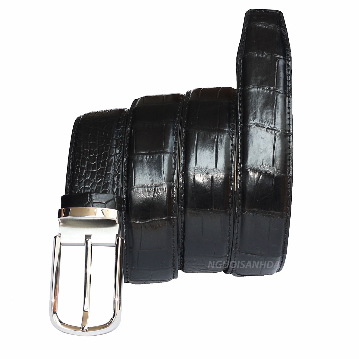 Thắt lưng da cá sấu thương hiệu NSD được làm từ da bụng liền nguyên con, mặt khóa kim chất liệu thép không gỉ. Dạng thắt lưng có may cạnh vừa giúp tăng độ bền, vừa chỉn chu, lịch sự, phù hợp với mọi trang phục quần Tây, quần Jean.