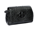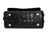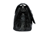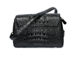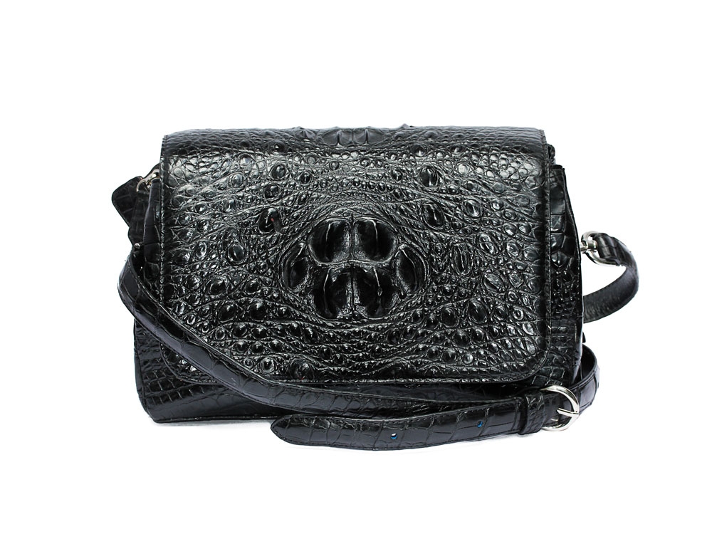 Túi đeo chéo nữ tầm trung da cá sấu xịn màu đen, được làm từ nguyên da cá sấu loại lớn chia đều cho các bộ phận túi.