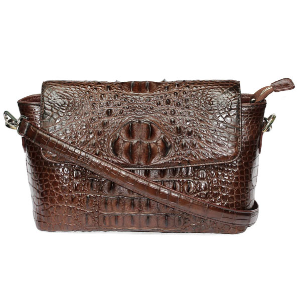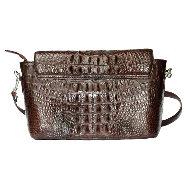 Túi xách nữ da cá sấu xịn màu nâu đậm. Kiểu túi bản trung đeo chéo đựng vừa các vật dụng thiết yếu của nữ, phù hợp cho các bữa tiệc lẫn trong công việc.