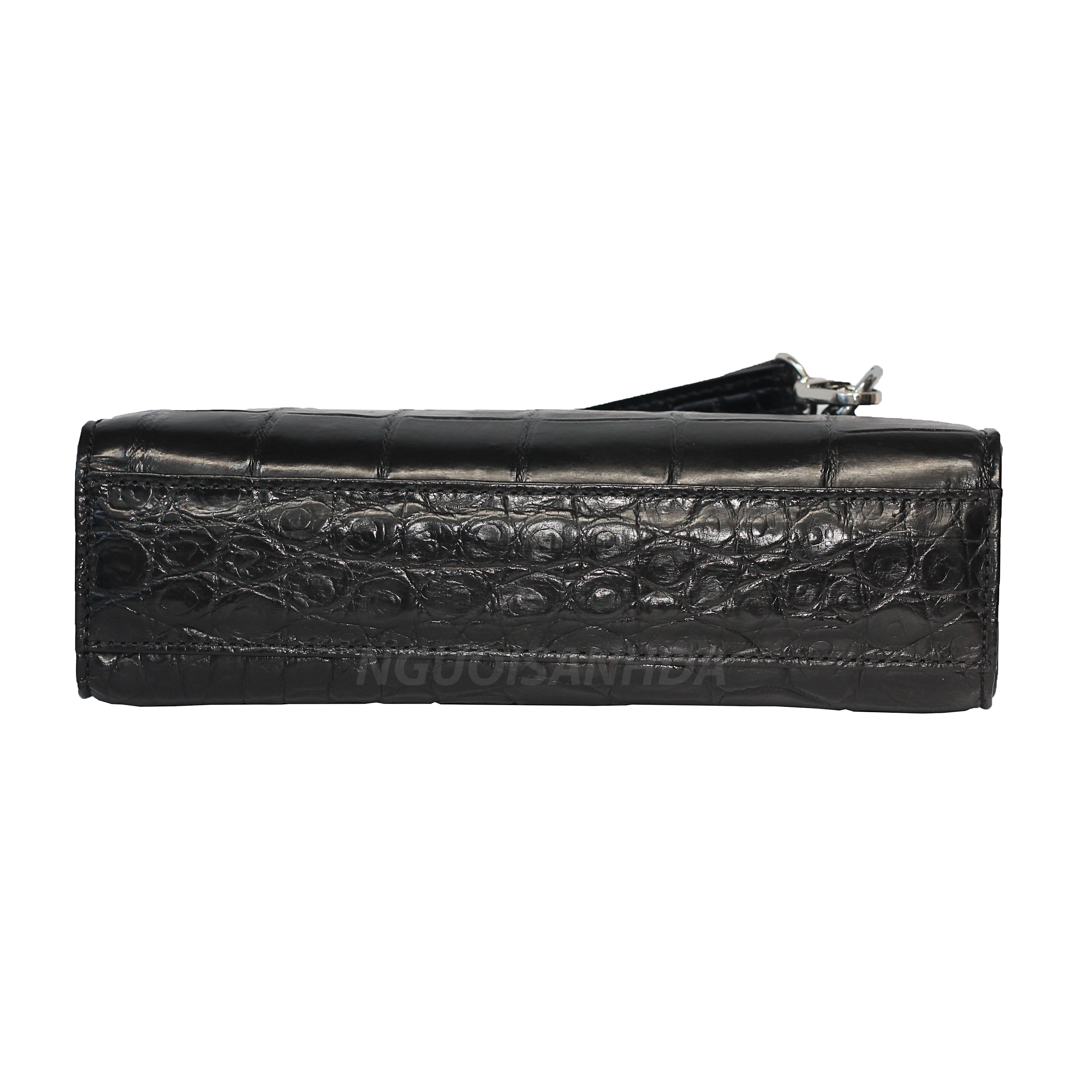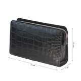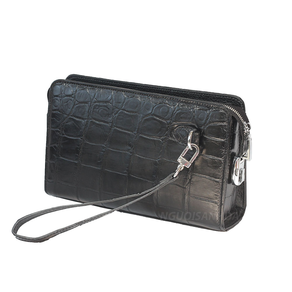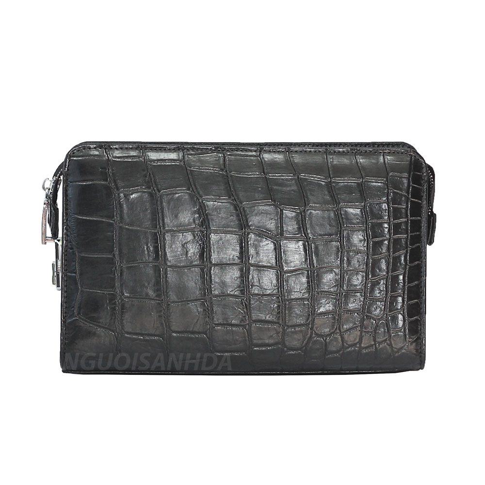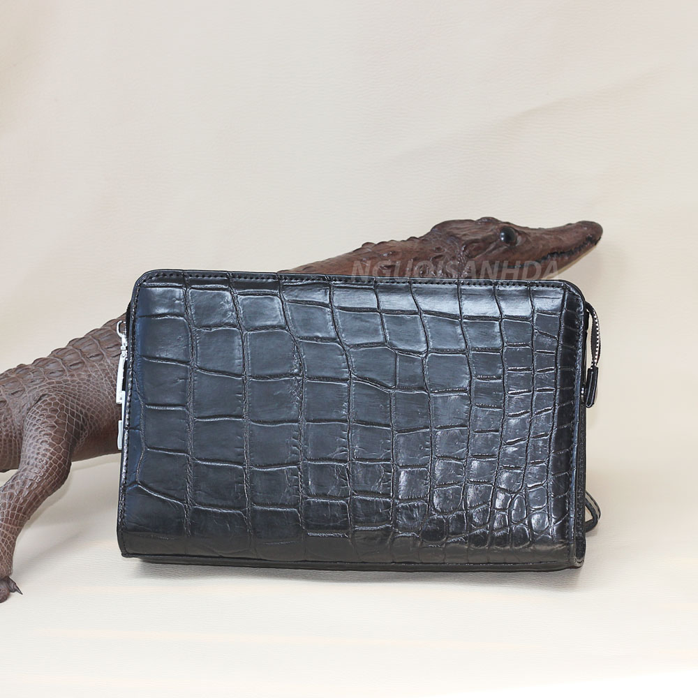 Ví cầm tay nam da cá sấu màu đen thiết kế 1 ngăn lớn có dây kéo và nhiều ngăn phụ để thẻ, căn cước công dân, bằng lái xe, tiền mặt,... Mặt ngoài làm từ nguyên miếng da bụng cá sấu lớn, mặt trong được lót bằng da bò loại 1.