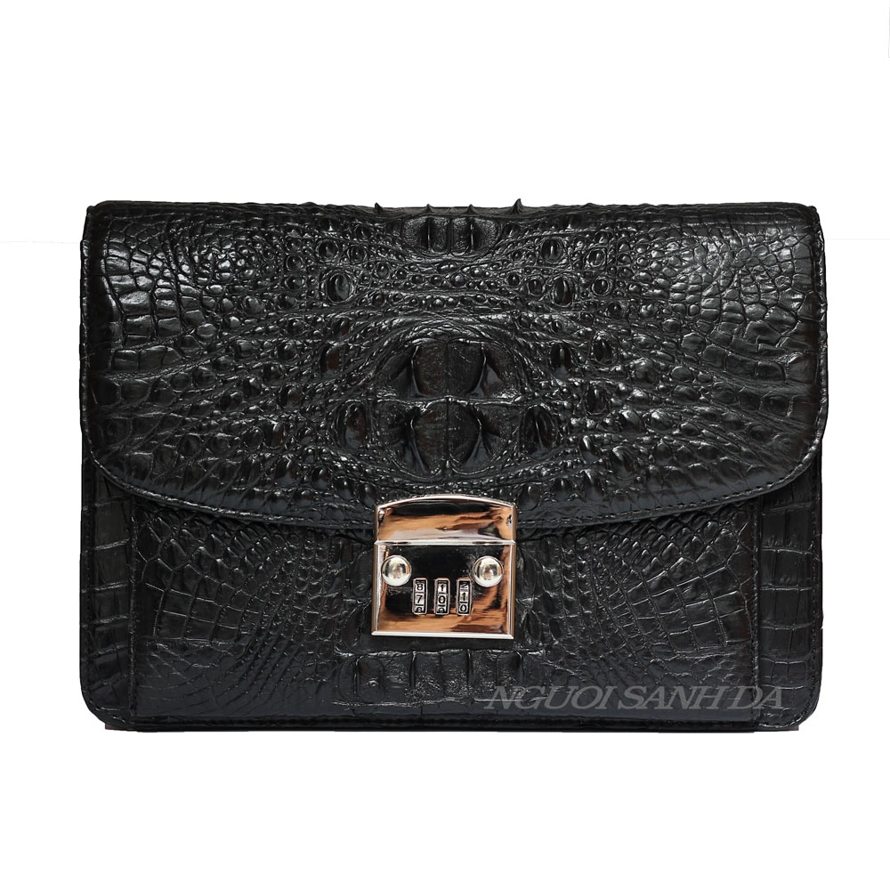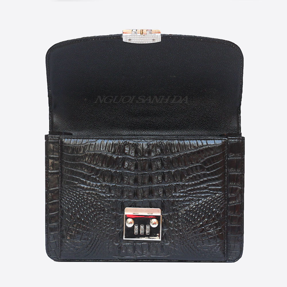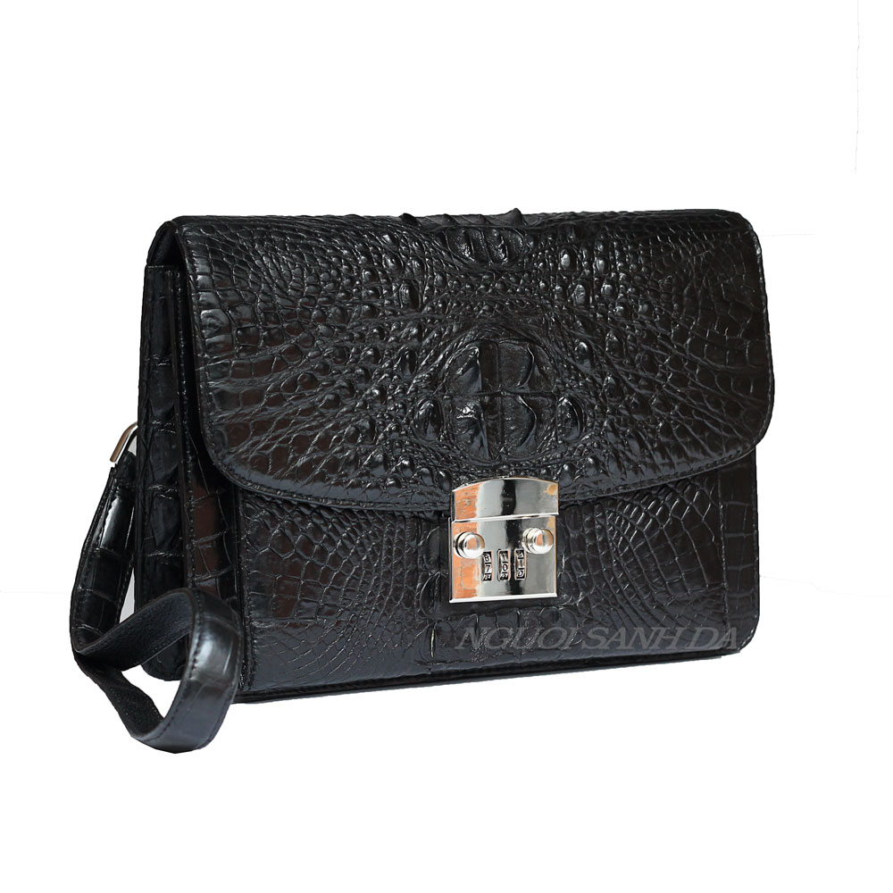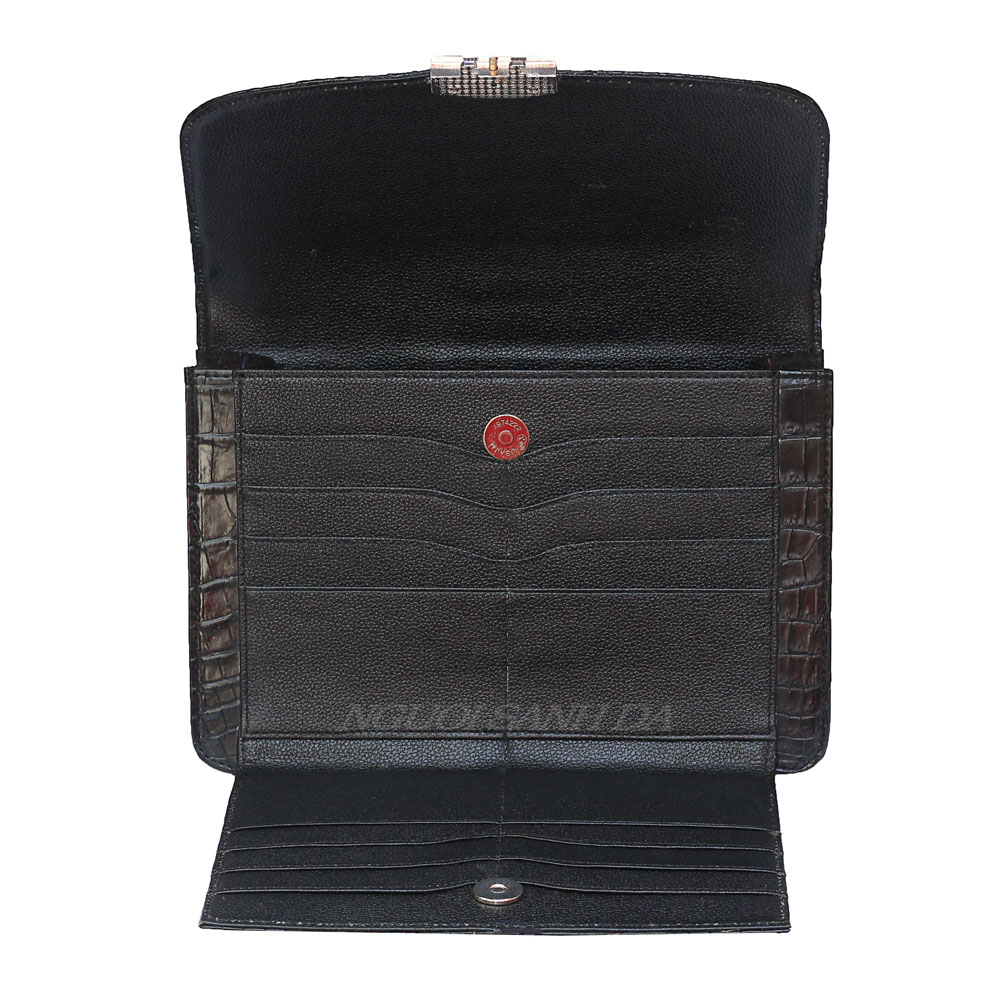 Vi cầm tay nam bản lớn chất liệu da cá sấu nguyên con màu nâu đen. Điểm nhấn chính của ví ở gù chạy xuống gai lưng cá sấu tầm trung khá nổi bật. Thiết kế bên trong và ngoài đựng vừa ipad, điện thoại và nhiều vật dụng quan trọng khác
