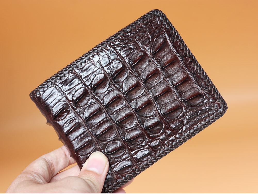 Ví da cá sấu gai lưng đan viền dạng ngang. Viền may tay thủ công cầu kỳ làm tăng giá trị cho ví hơn loại thông thường